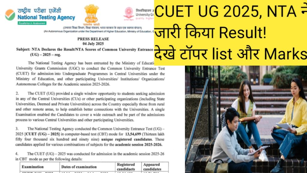 नेशनल टेस्टिंग एजेंसी (NTA) ने CUET UG 2025 (Common University Entrance Test – Undergraduate) का रिजल्ट 4 जुलाई 2025 को जारी कर दिया है। इस परीक्षा में भाग लेने वाले 13 लाख से अधिक छात्र-छात्राओं का इंतजार आखिरकार खत्म हो गया है। परिणाम को cuet.nta.nic.in पर जाकर डाउनलोड किया जा सकता है।