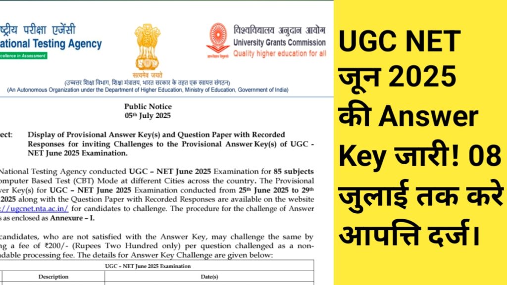 नेशनल टेस्टिंग एजेंसी (NTA) ने बहुप्रतीक्षित UGC NET जून 2025 परीक्षा की प्रोविजनल उत्तर कुंजी (Provisional Answer Key) 6 जुलाई 2025 को जारी कर दी है। परीक्षा में भाग लेने वाले उम्मीदवार अब आधिकारिक वेबसाइट ugcnet.nta.ac.in पर जाकर अपनी उत्तर कुंजी डाउनलोड कर सकते हैं और उसमें त्रुटि मिलने पर ऑनलाइन आपत्ति दर्ज कर सकते हैं।